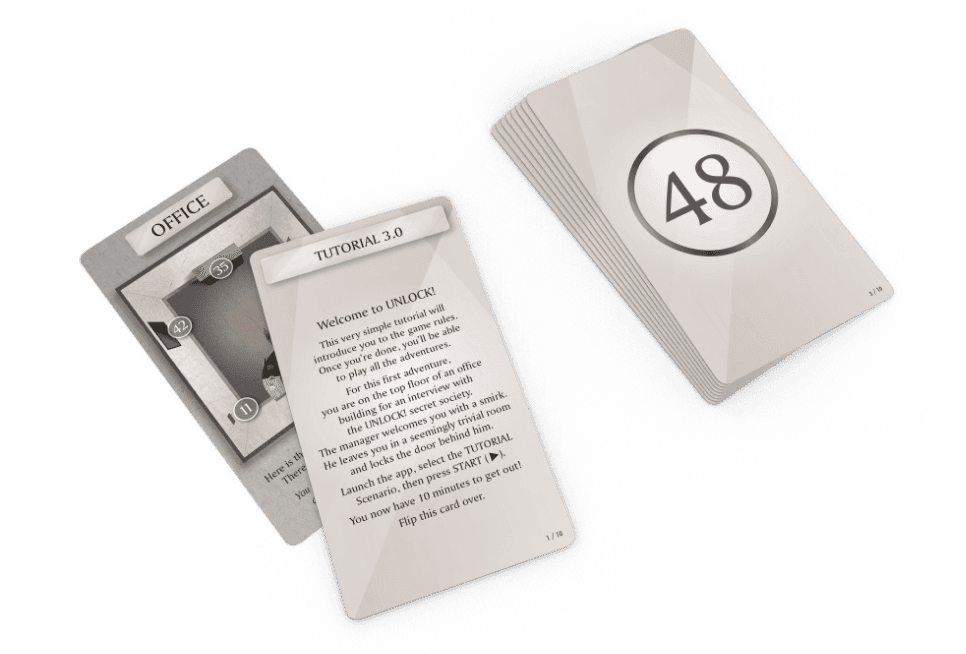 All gameplay is contained in a deck of cards. Solve riddles and combine items to overcome various challenges. Players use a free app to enter codes, solve puzzles, and receive hints. The app also works as a timer and offers thematic music and sound effects for every adventure.